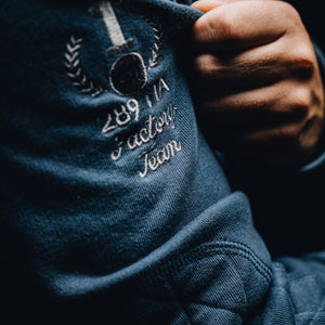Your Hillclimber Crewneck has embroidery and felt appliqué.